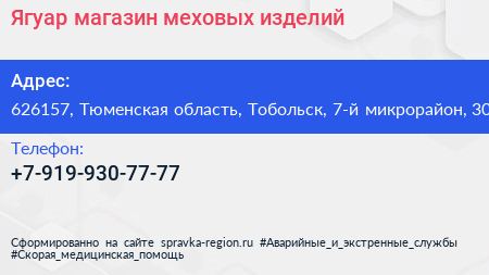 Ягуар, магазин меховых изделий по адресу 626157, Тюменская область, Тобольск, 7-й микрорайон, 30 в дальнейшем Организация, размещена в следующих категориях: