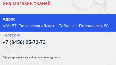 Яна, магазин тканей по адресу 626157, Тюменская область, Тобольск, Полонского, 58 в дальнейшем Организация, размещена в следующих категориях: