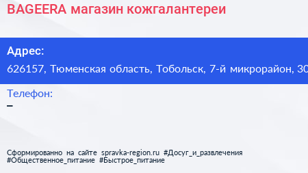 BAGEERA, магазин кожгалантереи по адресу 626157, Тюменская область, Тобольск, 7-й микрорайон, 30 в дальнейшем Организация, размещена в следующих категориях: