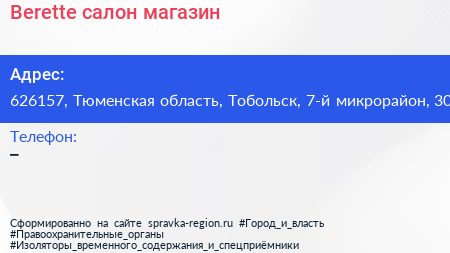 Berette, салон-магазин по адресу 626157, Тюменская область, Тобольск, 7-й микрорайон, 30 в дальнейшем Организация, размещена в следующих категориях: