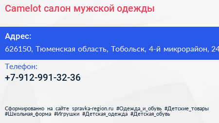 Camelot, салон мужской одежды по адресу 626150, Тюменская область, Тобольск, 4-й микрорайон, 24 в дальнейшем Организация, размещена в следующих категориях: