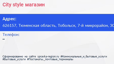 City style, магазин по адресу 626157, Тюменская область, Тобольск, 7-й микрорайон, 30 в дальнейшем Организация, размещена в следующих категориях: