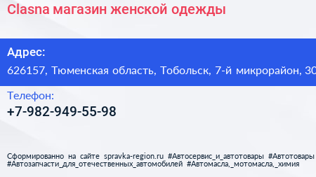Clasna, магазин женской одежды по адресу 626157, Тюменская область, Тобольск, 7-й микрорайон, 30 в дальнейшем Организация, размещена в следующих категориях:
