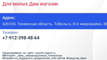 Для милых Дам, магазин по адресу 626150, Тюменская область, Тобольск, 8-й микрорайон, 38 в дальнейшем Организация, размещена в следующих категориях: