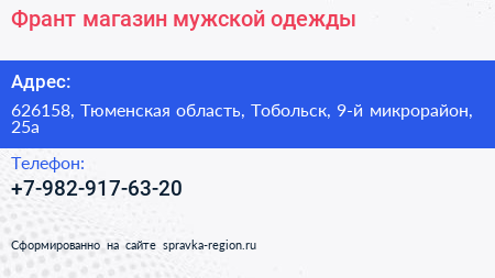 Франт, магазин мужской одежды по адресу 626158, Тюменская область, Тобольск, 9-й микрорайон, 25а в дальнейшем Организация, размещена в следующих категориях: