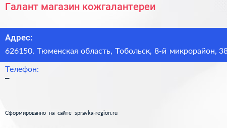 Галант, магазин кожгалантереи по адресу 626150, Тюменская область, Тобольск, 8-й микрорайон, 38 в дальнейшем Организация, размещена в следующих категориях: