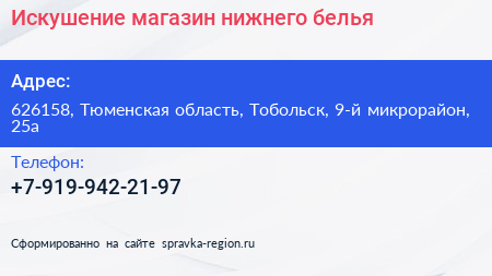 Искушение, магазин нижнего белья по адресу 626158, Тюменская область, Тобольск, 9-й микрорайон, 25а в дальнейшем Организация, размещена в следующих категориях: