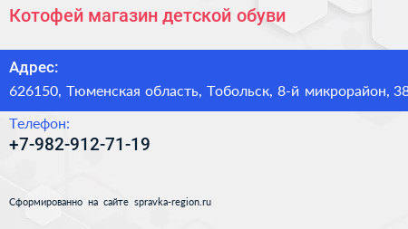 Котофей, магазин детской обуви по адресу 626150, Тюменская область, Тобольск, 8-й микрорайон, 38 в дальнейшем Организация, размещена в следующих категориях: