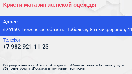 Кристи, магазин женской одежды по адресу 626150, Тюменская область, Тобольск, 8-й микрорайон, 41 в дальнейшем Организация, размещена в следующих категориях: