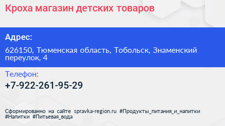 Кроха, магазин детских товаров по адресу 626150, Тюменская область, Тобольск, Знаменский переулок, 4 в дальнейшем Организация, размещена в следующих категориях: