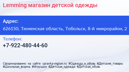 Lemming, магазин детской одежды по адресу 626150, Тюменская область, Тобольск, 8-й микрорайон, 2 в дальнейшем Организация, размещена в следующих категориях: