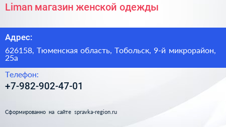 Liman, магазин женской одежды по адресу 626158, Тюменская область, Тобольск, 9-й микрорайон, 25а в дальнейшем Организация, размещена в следующих категориях: