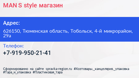 MAN`S style, магазин по адресу 626150, Тюменская область, Тобольск, 4-й микрорайон, 29а в дальнейшем Организация, размещена в следующих категориях: