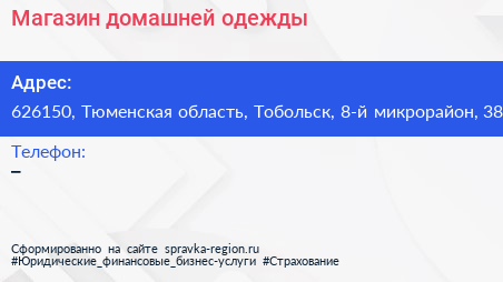 Магазин домашней одежды по адресу 626150, Тюменская область, Тобольск, 8-й микрорайон, 38 в дальнейшем Организация, размещена в следующих категориях: