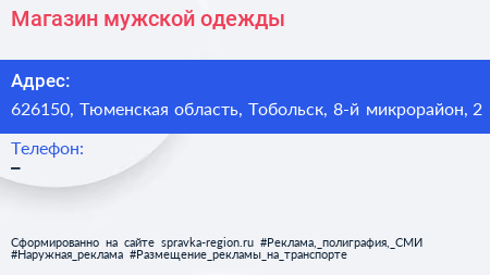 Магазин мужской одежды по адресу 626150, Тюменская область, Тобольск, 8-й микрорайон, 2 в дальнейшем Организация, размещена в следующих категориях: