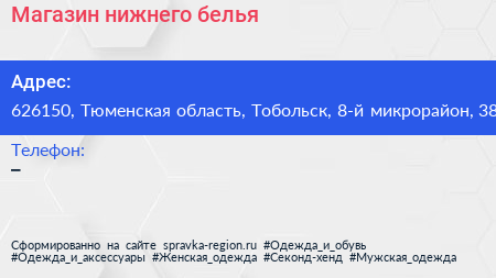 Магазин нижнего белья по адресу 626150, Тюменская область, Тобольск, 8-й микрорайон, 38 в дальнейшем Организация, размещена в следующих категориях: