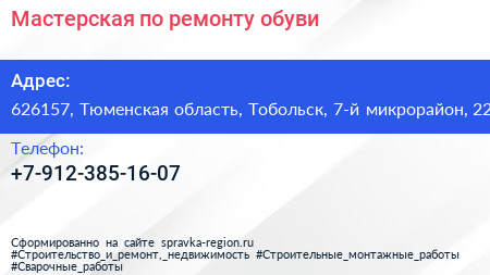 Мастерская по ремонту обуви по адресу 626157, Тюменская область, Тобольск, 7-й микрорайон, 22 в дальнейшем Организация, размещена в следующих категориях: