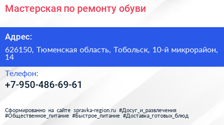 Мастерская по ремонту обуви по адресу 626150, Тюменская область, Тобольск, 10-й микрорайон, 14 в дальнейшем Организация, размещена в следующих категориях: