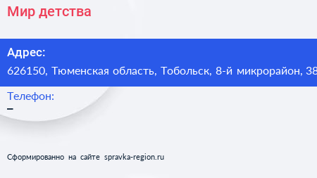 Мир детства по адресу 626150, Тюменская область, Тобольск, 8-й микрорайон, 38 в дальнейшем Организация, размещена в следующих категориях: