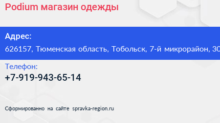 Podium, магазин одежды по адресу 626157, Тюменская область, Тобольск, 7-й микрорайон, 30 в дальнейшем Организация, размещена в следующих категориях: