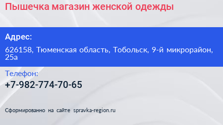 Пышечка, магазин женской одежды по адресу 626158, Тюменская область, Тобольск, 9-й микрорайон, 25а в дальнейшем Организация, размещена в следующих категориях:
