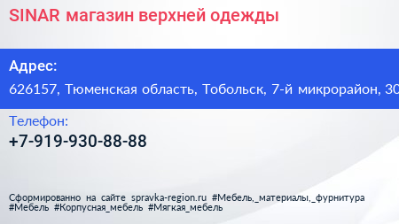 SINAR, магазин верхней одежды по адресу 626157, Тюменская область, Тобольск, 7-й микрорайон, 30 в дальнейшем Организация, размещена в следующих категориях: