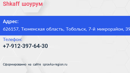 Shkaff, шоурум по адресу 626157, Тюменская область, Тобольск, 7-й микрорайон, 39 в дальнейшем Организация, размещена в следующих категориях: