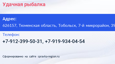 Удачная рыбалка по адресу 626157, Тюменская область, Тобольск, 7-й микрорайон, 39 в дальнейшем Организация, размещена в следующих категориях: