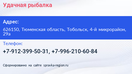 Удачная рыбалка по адресу 626150, Тюменская область, Тобольск, 4-й микрорайон, 29а в дальнейшем Организация, размещена в следующих категориях: