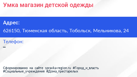 Умка, магазин детской одежды по адресу 626150, Тюменская область, Тобольск, Мельникова, 24 в дальнейшем Организация, размещена в следующих категориях: