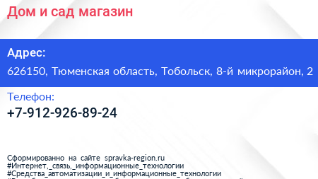 Дом и сад, магазин по адресу 626150, Тюменская область, Тобольск, 8-й микрорайон, 2 в дальнейшем Организация, размещена в следующих категориях: