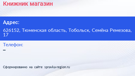 Книжник, магазин по адресу 626152, Тюменская область, Тобольск, Семёна Ремезова, 17 в дальнейшем Организация, размещена в следующих категориях: