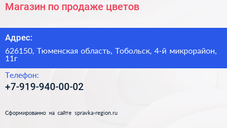 Магазин по продаже цветов по адресу 626150, Тюменская область, Тобольск, 4-й микрорайон, 11г в дальнейшем Организация, размещена в следующих категориях: