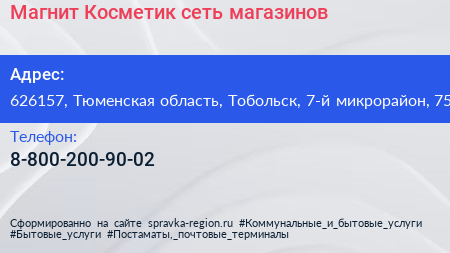 Магнит-Косметик, сеть магазинов по адресу 626157, Тюменская область, Тобольск, 7-й микрорайон, 75 в дальнейшем Организация, размещена в следующих категориях: