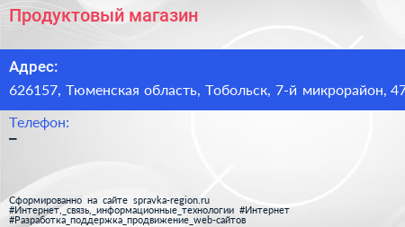 Продуктовый магазин по адресу 626157, Тюменская область, Тобольск, 7-й микрорайон, 47 в дальнейшем Организация, размещена в следующих категориях:
