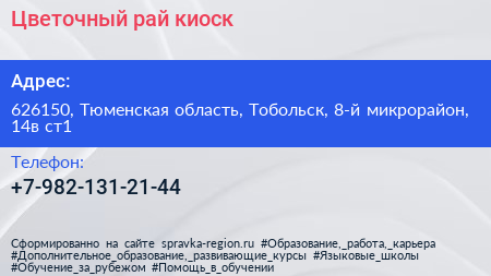Цветочный рай, киоск по адресу 626150, Тюменская область, Тобольск, 8-й микрорайон, 14в ст1 в дальнейшем Организация, размещена в следующих категориях: