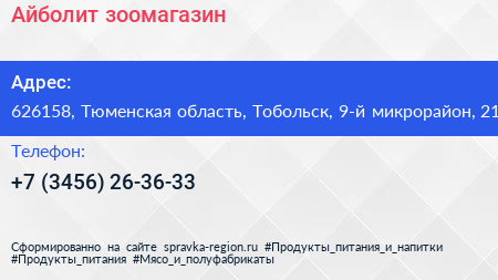 Айболит, зоомагазин по адресу 626158, Тюменская область, Тобольск, 9-й микрорайон, 21 в дальнейшем Организация, размещена в следующих категориях: