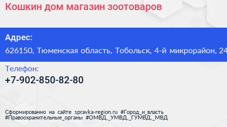 Кошкин дом, магазин зоотоваров по адресу 626150, Тюменская область, Тобольск, 4-й микрорайон, 24 в дальнейшем Организация, размещена в следующих категориях: