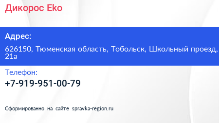 Дикорос Eko по адресу 626150, Тюменская область, Тобольск, Школьный проезд, 21а в дальнейшем Организация, размещена в следующих категориях: