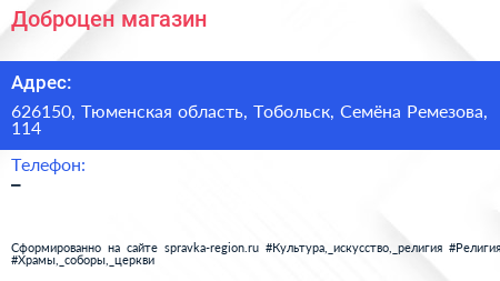 Доброцен, магазин по адресу 626150, Тюменская область, Тобольск, Семёна Ремезова, 114 в дальнейшем Организация, размещена в следующих категориях: