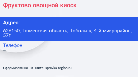 Фруктово-овощной киоск по адресу 626150, Тюменская область, Тобольск, 4-й микрорайон, 57г в дальнейшем Организация, размещена в следующих категориях: