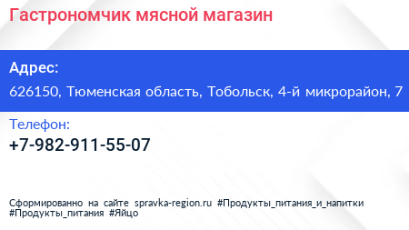 Гастрономчик, мясной магазин по адресу 626150, Тюменская область, Тобольск, 4-й микрорайон, 7 в дальнейшем Организация, размещена в следующих категориях: