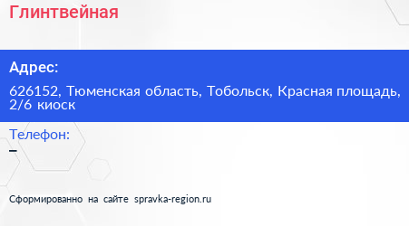 Глинтвейная по адресу 626152, Тюменская область, Тобольск, Красная площадь, 2/6 киоск в дальнейшем Организация, размещена в следующих категориях:
