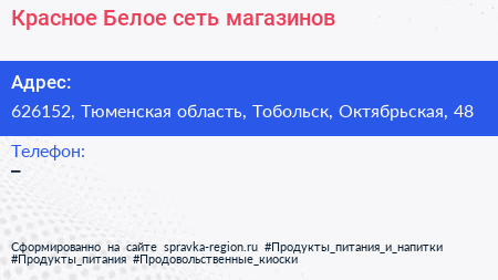 Красное & Белое, сеть магазинов по адресу 626152, Тюменская область, Тобольск, Октябрьская, 48 в дальнейшем Организация, размещена в следующих категориях: