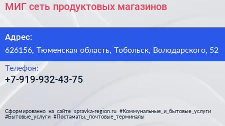 МИГ, сеть продуктовых магазинов по адресу 626156, Тюменская область, Тобольск, Володарского, 52 в дальнейшем Организация, размещена в следующих категориях: