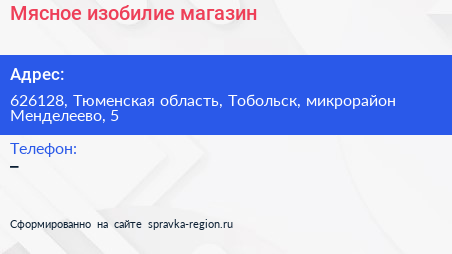 Мясное изобилие, магазин по адресу 626128, Тюменская область, Тобольск, микрорайон Менделеево, 5 в дальнейшем Организация, размещена в следующих категориях: