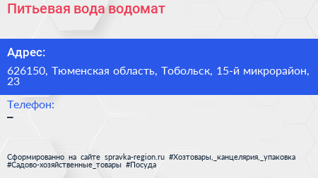 Питьевая вода, водомат по адресу 626150, Тюменская область, Тобольск, 15-й микрорайон, 23 в дальнейшем Организация, размещена в следующих категориях: