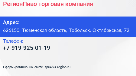 РегионПиво, торговая компания по адресу 626150, Тюменская область, Тобольск, Октябрьская, 72 в дальнейшем Организация, размещена в следующих категориях: