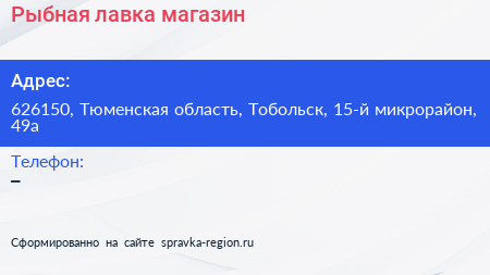 Рыбная лавка, магазин по адресу 626150, Тюменская область, Тобольск, 15-й микрорайон, 49а в дальнейшем Организация, размещена в следующих категориях: