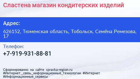 Сластена, магазин кондитерских изделий по адресу 626152, Тюменская область, Тобольск, Семёна Ремезова, 17 в дальнейшем Организация, размещена в следующих категориях: